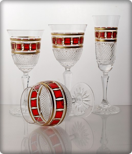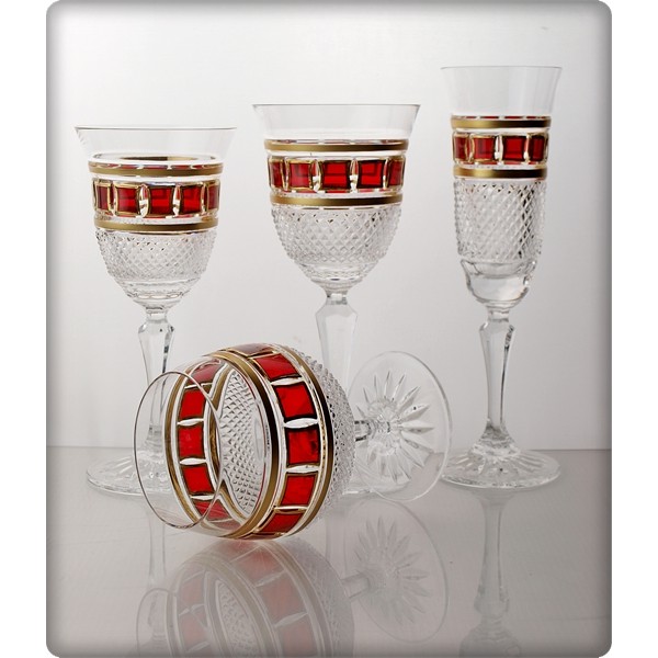 Cristal de Bohême agrémenté d’une teinture de couleur rouge et d’un pourtour en or 12ct. Cette collection réunit couleur et beauté, offrant un service à verres dynamique et coloré.